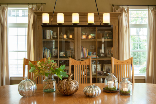 Una sala da pranzo formale viene resa più speciale ed intima grazie agli elementi naturali ed alle candele posizionati al centro del tavolo da pranzo.