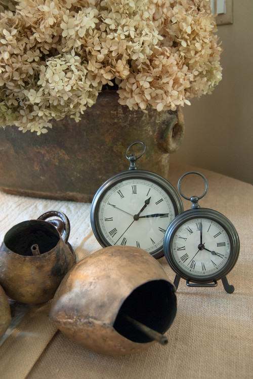 Un libretto antico avvolto nello spago, in una ciotola di vetro circondato da campane di vetro, adorna il tavolino da cocktail del salotto. Due orologi da tasca e ancora le ortensie verdi del giardino per una ltro angolo prezioso: gli orari mostrati dai quandranti sono diversi tra loro e segnano l'ora del campo estero dove vivono i due figli della coppia, entrambi militari.